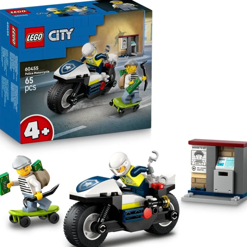 Verras je kleine held met deze LEGO City 60455 Achtervolging Op Politiemotor. De set bevat een coole politiemotor met brede banden, een skateboard waarop een boef ontsnapt en een minigeldautomaat met een speelgoedbankbiljet.