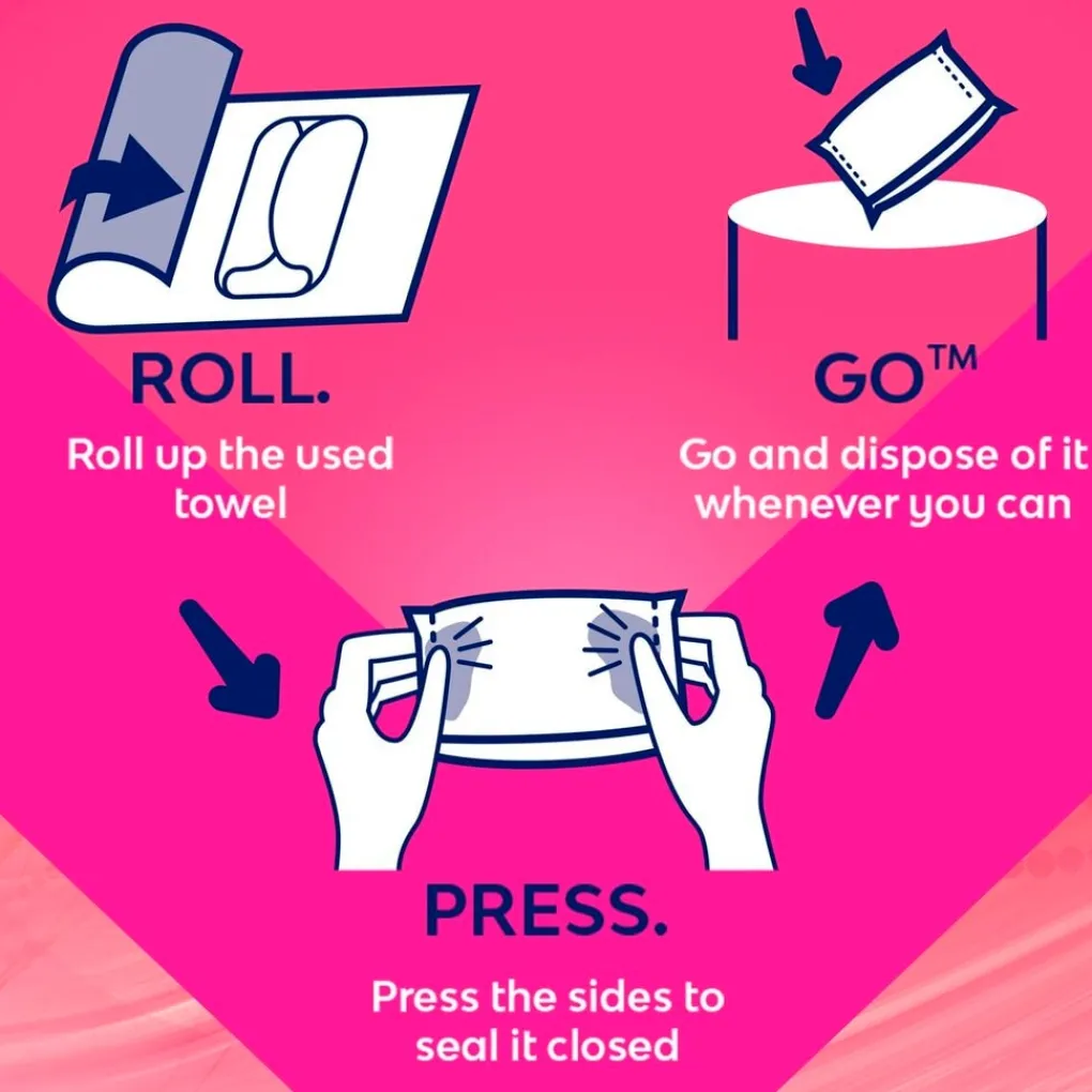 Dankzij de Roll Press Go-technologie is dit maandverband gemakkelijk te gebruiken, hygiënisch en discreet zodat je het veilig weg kan gooien. Wikkel gewoon een nieuw maandverband uit en rol de gebruikte op in de wikkel. Gebruik de zijkanten om het dicht te maken, en je bent klaar om te gaan. Zelfs als je niet in de buurt bent van een prullenbak kun je het maandverband in je tas stoppen, in de wetenschap dat het maandverband niet opengaat: de verzegelde Roll Press Go-wikkel blijft stevig zitten.