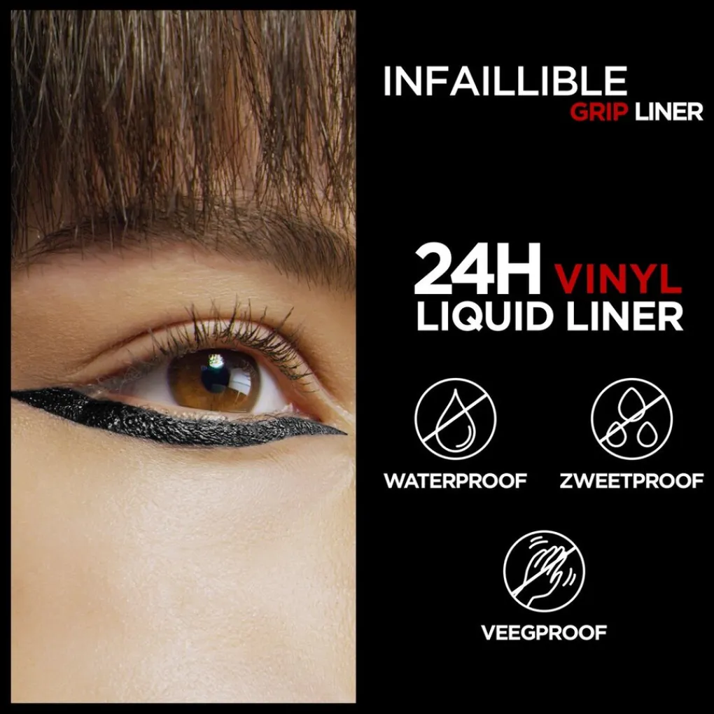 De Infaillible Grip 24H Vinyl Liquid liner behoudt zijn kleurintensiteit tot 24 uur* en is waterproof. Je eyeliner blijft dus de hele dag zitten, zonder te vlekken. De Vinyl Liquid Liner heeft en glossy finish.
