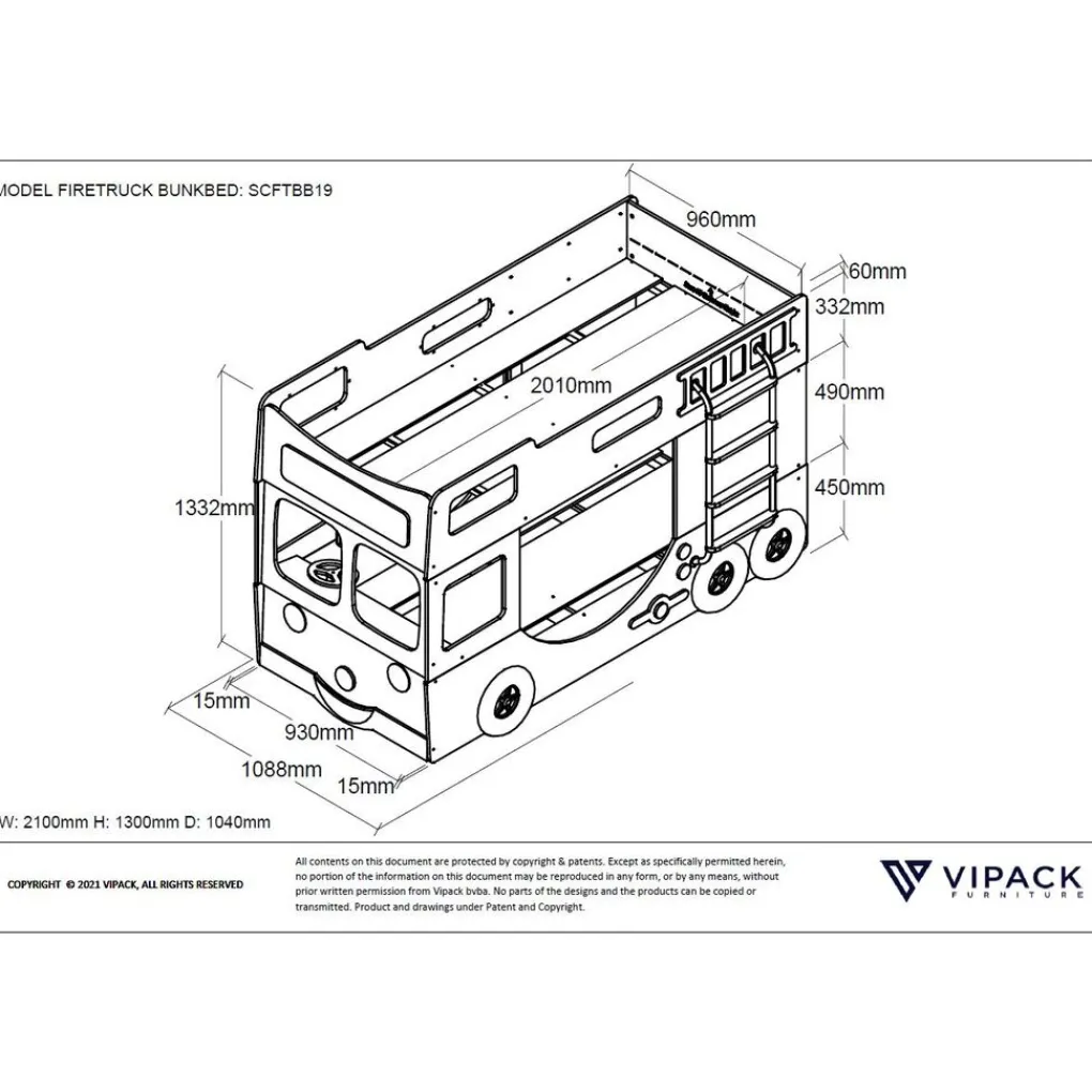 Dit NEW FIRE TRUCK stapelbed is vervaardigd uit rood gelakte MDF. De lattenbodem is inclusief en is geschikt voor een matras van 90x200cm