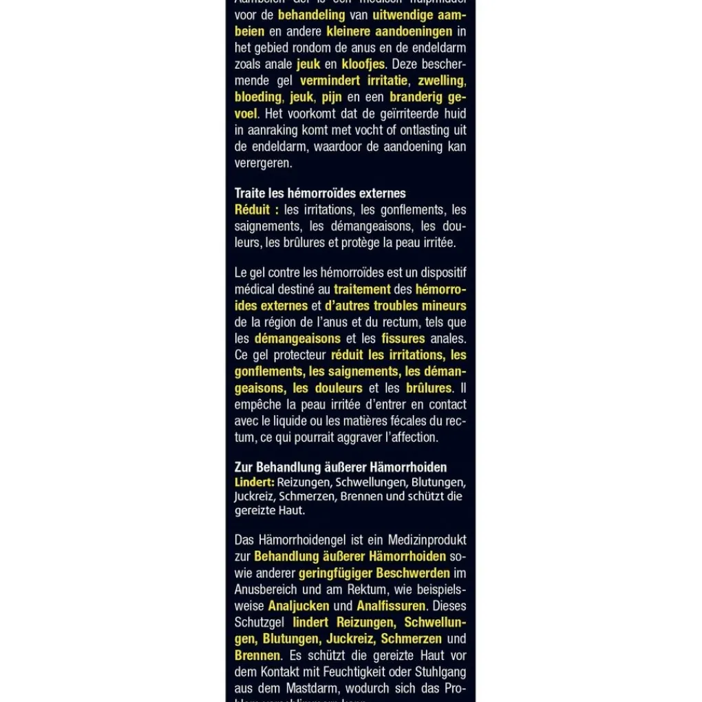 Knijp zachtjes in de tube en breng een kleine hoeveelheid aan op uw vinger. Breng de gel met uw vinger aan rondom uw anus. Was uw handen telkens grondig met warm water en zeep nadat u de gel heeft aangebracht. Breng de gel twee tot vier keer per dag aan, bij voorkeur na de stoelgang heeft gehad.