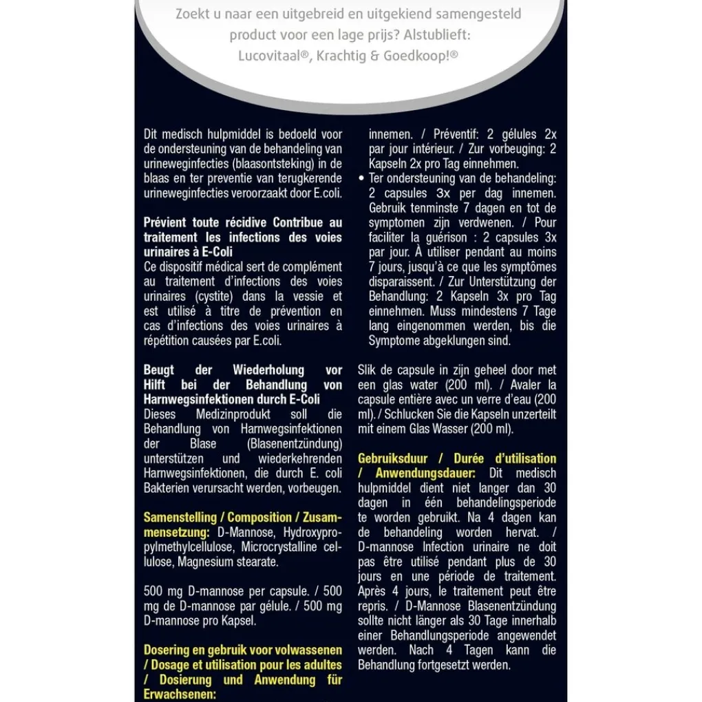 Ingrediënten: D-Mannose, Hydroxypropylmethylcellulose, Microcrystalline cellulose, Magnesium stearate.