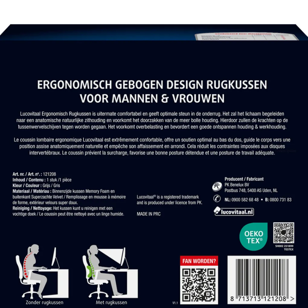 Lucovitaal Ergonomisch Rugkussen is uitermate comfortabel en geeft optimale steun in de onderrug, zal het lichaam begeleiden naar een anatomische natuurlijke zithouding en voorkomt het doorzakken van de meer bolle houding. Hierdoor zullen de krachten op de tussenwervelschijven tegen worden gegaan. Het voorkomt overbelasting en bevordert een goede ontspannen houding & werkhouding.