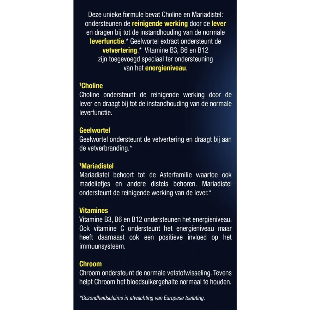 Bevat geen zout. Geen suikers toegevoegd.;Claimbeschrijving|¹Choline ondersteunt de reinigende werking door de lever en draagt bij tot de instandhouding van de normale leverfunctie.;Claimbeschrijving|Vitamine B3, B6 en B12 ondersteunen het energieniveau. Ook vitamine C ondersteunt het energieniveau maar heeft daarnaast ook een positieve invloed op het immuunsysteem. Chroom ondersteunt de normale vetstofwisseling. Tevens helpt Chroom het bloedsuikergehalte normaal te houden.;Claimbeschrijving|Mariadistel ondersteunt de reinigende werking van de lever.**Gezondheidsclaims in afwachting van Europese toelating;Claimbeschrijving|Geelwortel ondersteunt de vetvertering endraagt bij aan de vetverbranding.**Gezondheidsclaims in afwachting vanEuropese toelating