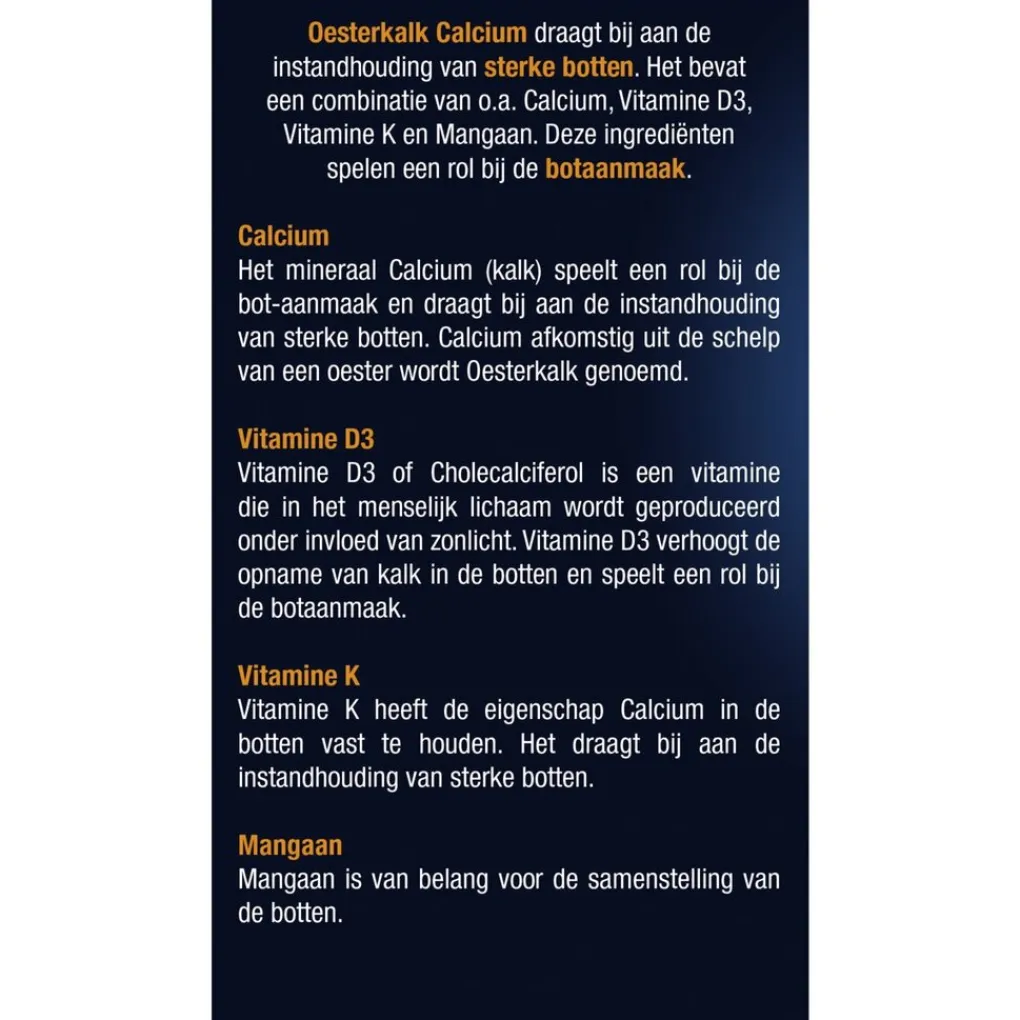 Bevat geen zout. Geen suikers toegevoegd;Het mineraal Calcium (kalk) speelt een rol bij de bot-aanmaak en draagt bij aan de instandhouding van sterke botten. Vitamine D3 verhoogt de opname van kalk in de botten en speelt een rol bij de botaanmaak. Vitamine K heeft de eigenschap Calcium in de botten vast te houden. Het draagt bij aan de instandhouding van sterke botten. Mangaan is van belang voor de samenstelling van de botten.