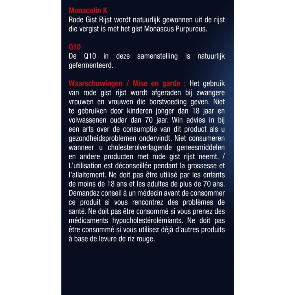 Ingrediënten: Vulmiddelen (Microkristallijne cellulose), Calciumcarbonaat, Rode gist rijst (Monascus Purpureus), Co-Enzym Q10, Antiklontermiddelen (Colloïdale siliciumdioxide, Magnesiumzouten uit vetzuren), Coating (Hydroxypropylmethylcellulose).