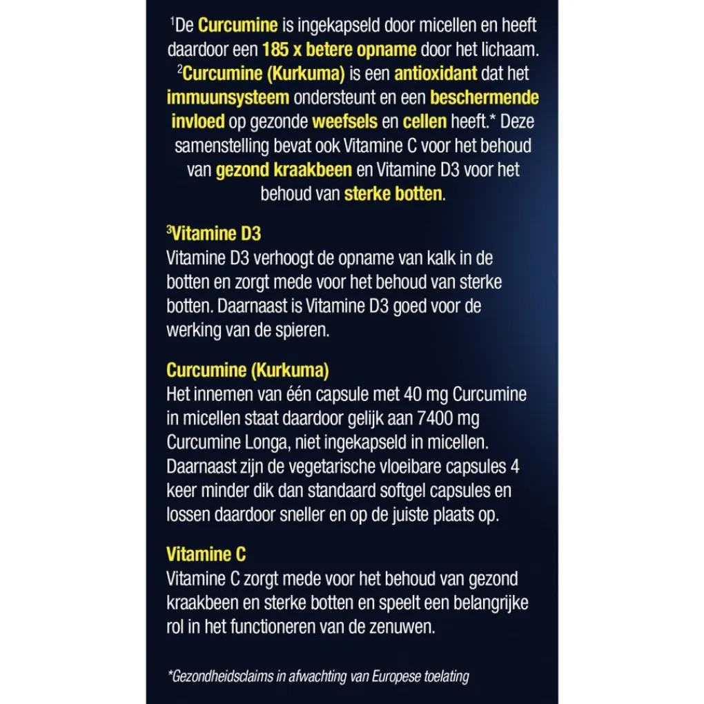 ²Curcumine (Kurkuma) is een antioxidant dathet immuunsysteem ondersteunt en eenbeschermende invloed op gezonde weefselsen cellen heeft.* Vitamine D3 verhoogt deopname van kalk in de botten en zorgt medevoor het behoud van sterke botten. Daarnaastis vitamine D3 goed voor de werking van despieren. Vitamine C zorgt mede voor hetbehoud van gezond kraakbeen en sterkebotten en speelt een belangrijke rol in hetfunctioneren van de zenuwen.*Gezondheidsclaims in afwachting vanEuropese toelating. Bevat geen zout. Geensuikers toegevoegd.