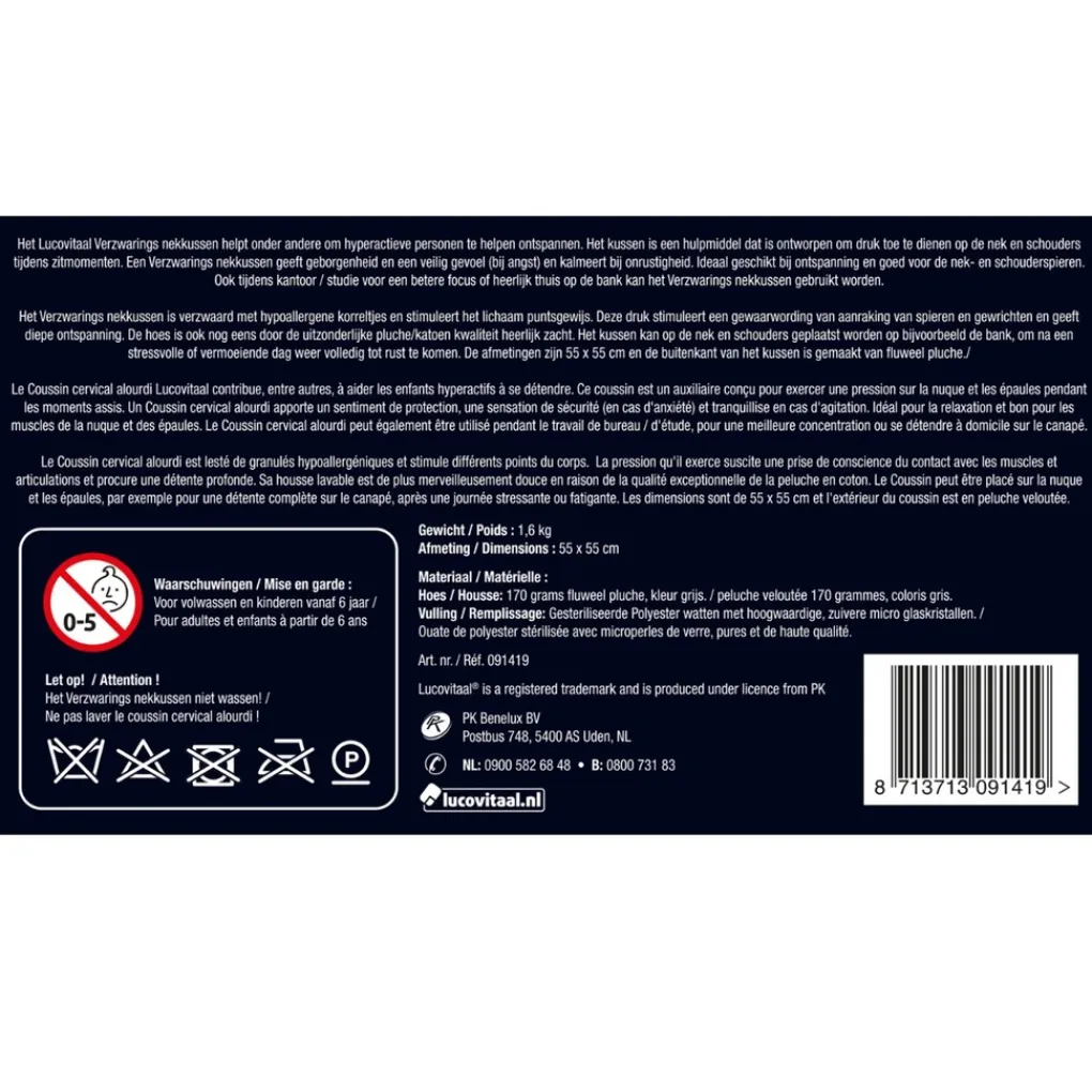 Het Verzwaringsnekkussen is verzwaard met hypoallergene korreltjes en stimuleert het lichaam puntsgewijs. Deze druk stimuleert een gewaarwording van aanraking van spieren en gewrichten en geeft diepe ontspanning. De hoes is ook nog eens door de uitzonderlijke pluche/katoen kwaliteit heerlijk zacht. Het kussen kan op de nek en schouders geplaats worden op bijvoorbeeld de bank, om na een stressvolle of vermoeiende dag weer volledig tot rust te komen. De afmetingen zijn 55 x 55 cm en de buitenkant van het kussen is gemaakt van fluweel pluche.