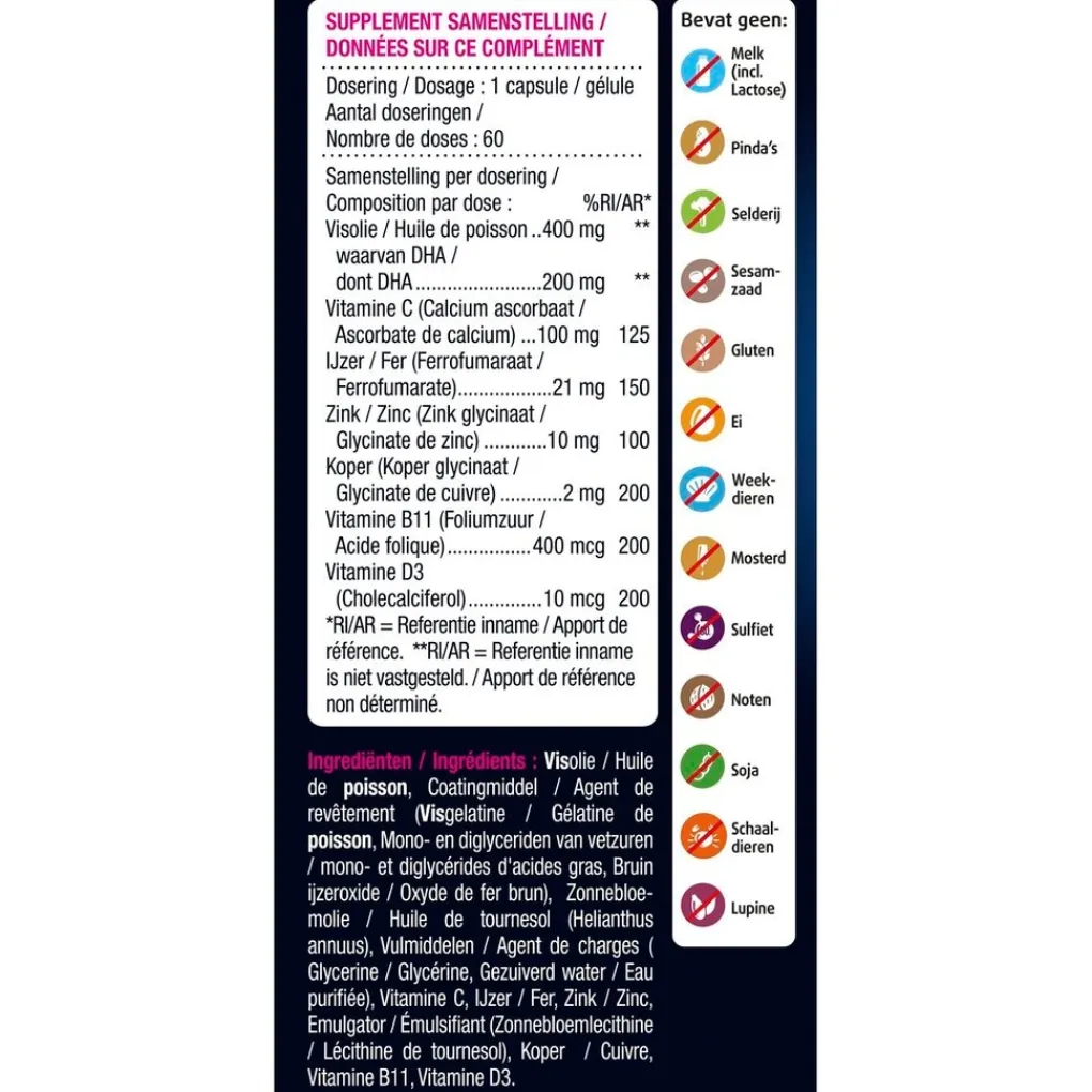 Ingrediënten: VISolie, Coatingmiddel (VISgelatine, Mono- en diglyceriden van vetzuren, Bruin ijzeroxide), Zonnebloemolie (Helianthus annuus), Vulmiddelen ( Glycerine, Gezuiverd water), Vitamine C, IJzer, Zink, Emulgator (Zonnebloemlecithine), Koper, Vitamine B11, Vitamine D3