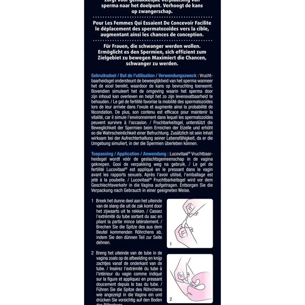 Lucovitaal Vruchtbaarheidsgel wordt vóór de geslachtsgemeenschap in de vagina geknepen.