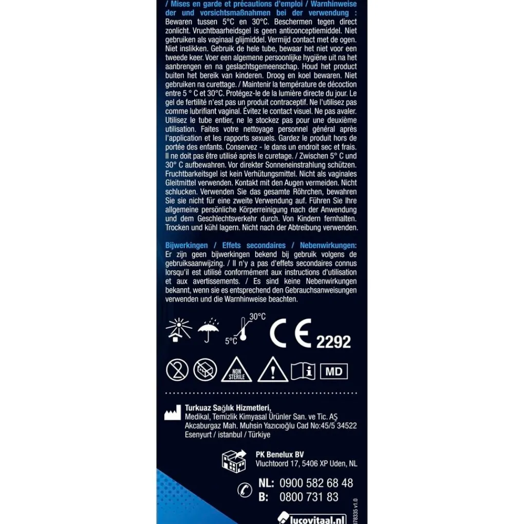 Vruchtbaarheidsgel is geen anticonceptiemiddel. Niet gebruiken als vaginaal glijmiddel. Vermijd contact met de ogen. Niet inslikken. Gebruik de hele tube, bewaar het niet voor een tweede keer. Voer een algemene persoonlijke hygiëne uit na het aanbrengen en na geslachtsgemeenschap. Niet gebruiken na curettage.