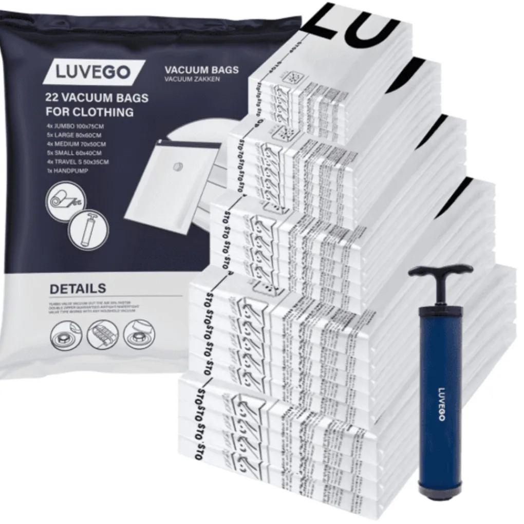 Of je nu ruimte wilt besparen in je koffer, meer plek wilt in je kledingkast of die enorme knuffels van je kinderen wilt opbergen, gebruik dan de vacuümzakken van Luvego. Deze vacuüm opbergzakken set bestaande uit 22 vacuümzakken inclusief handpomp bevat zakken in verschillende maten van kleine tot Jumbo zakken mét 2 oprolzakken voor op reis!