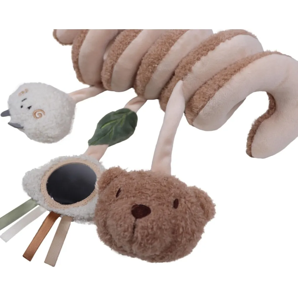 Aan de spiraal hangen drie lieve speeltjes: een vrolijk wolkje, een zacht teddy schaapje en natuurlijk Bowie de Beer zelf. Ieder speeltje biedt iets unieks: een veilig spiegeltje, een squeeze geluidje en verschillende stoffen die de zintuigen van je kindje prikkelen. Leuk om naar te kijken, nog leuker om te ontdekken!