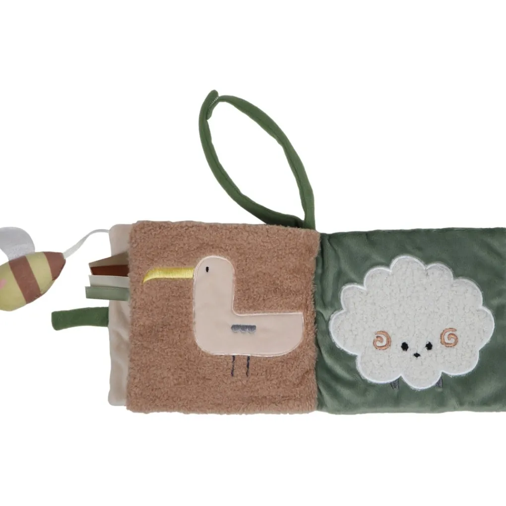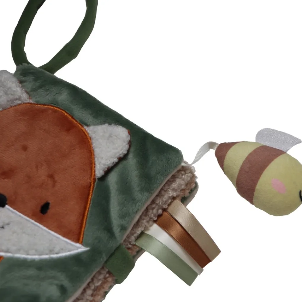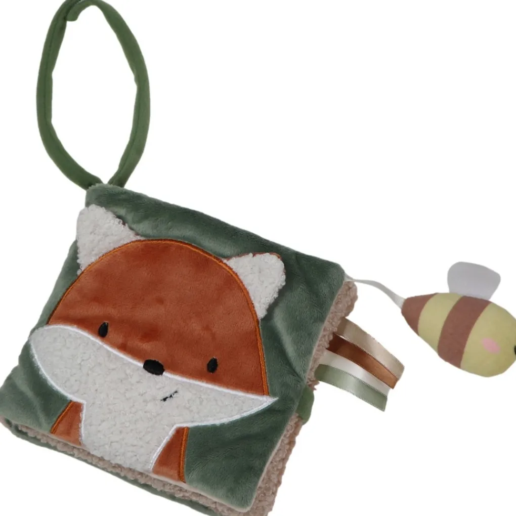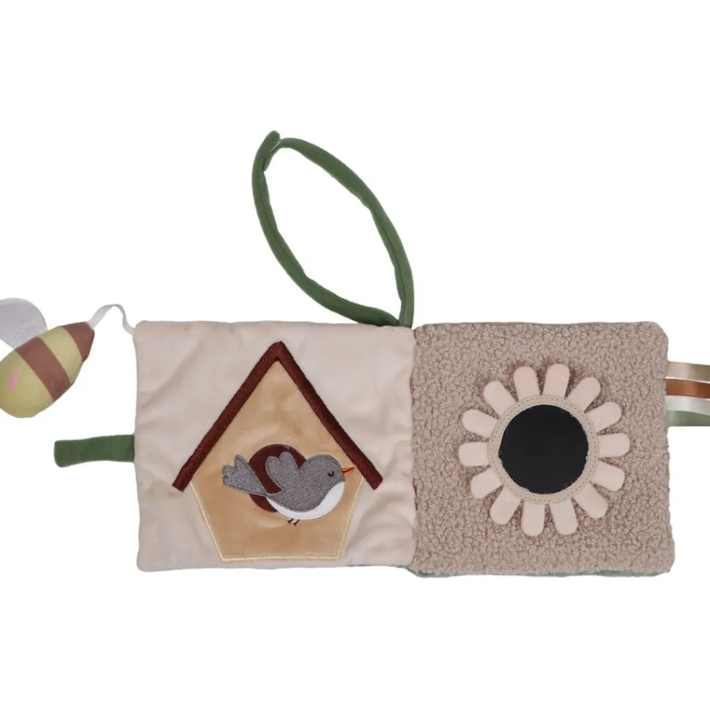 Het boekje heeft zes zachte pagina’s vol met vrolijke figuurtjes, verschillende kleuren en structuren. Je kindje ontdekt onder andere een loshangend bijtje, een veilig spiegeltje, knisperend crinkle materiaal en verschillende labeltjes om vast te pakken en te voelen. Dat prikkelt de zintuigen en stimuleert de fijne motoriek.