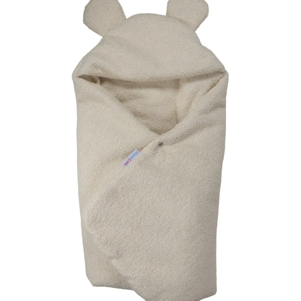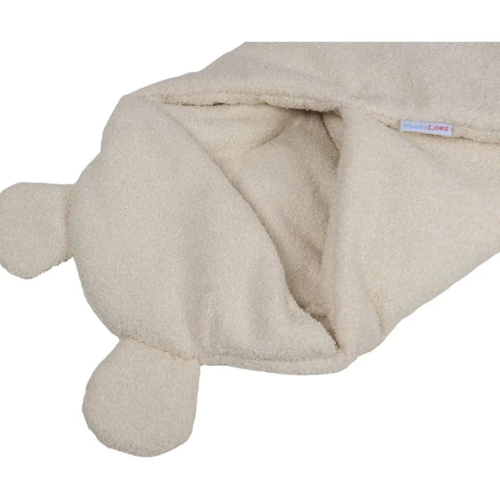 Deze deken is gemaakt van teddy bouclé stof aan de binnen- en buitenkant! Extra zacht dus. Deze wikkeldeken is 75 x 75 cm groot.