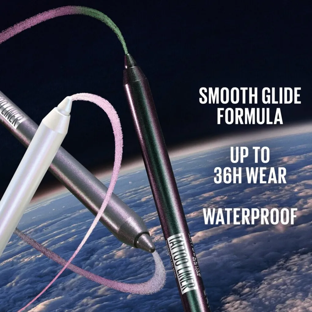 Ervaar intense kleur die tot wel 36 uur aanhoudt in galactic duochrome tinten die schitteren met kosmische glans met het Maybelline New York Tattoo Liner 823 Aurora Flip Gel Pencil.