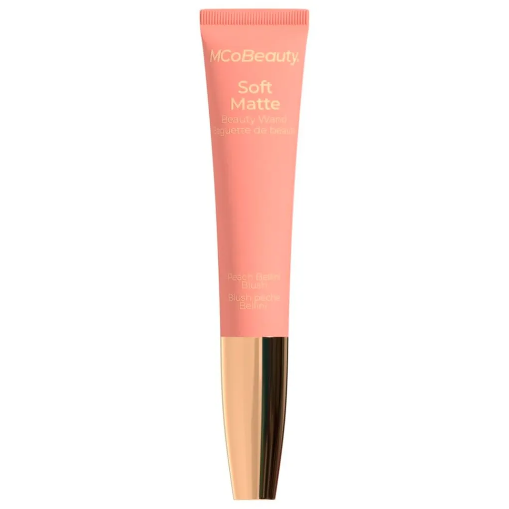 De MCoBeauty Soft Matte Peach Bellini Blush Beauty Wand is een vloeibare blush met een matte finish die kleur en definitie aan je gezicht geeft.