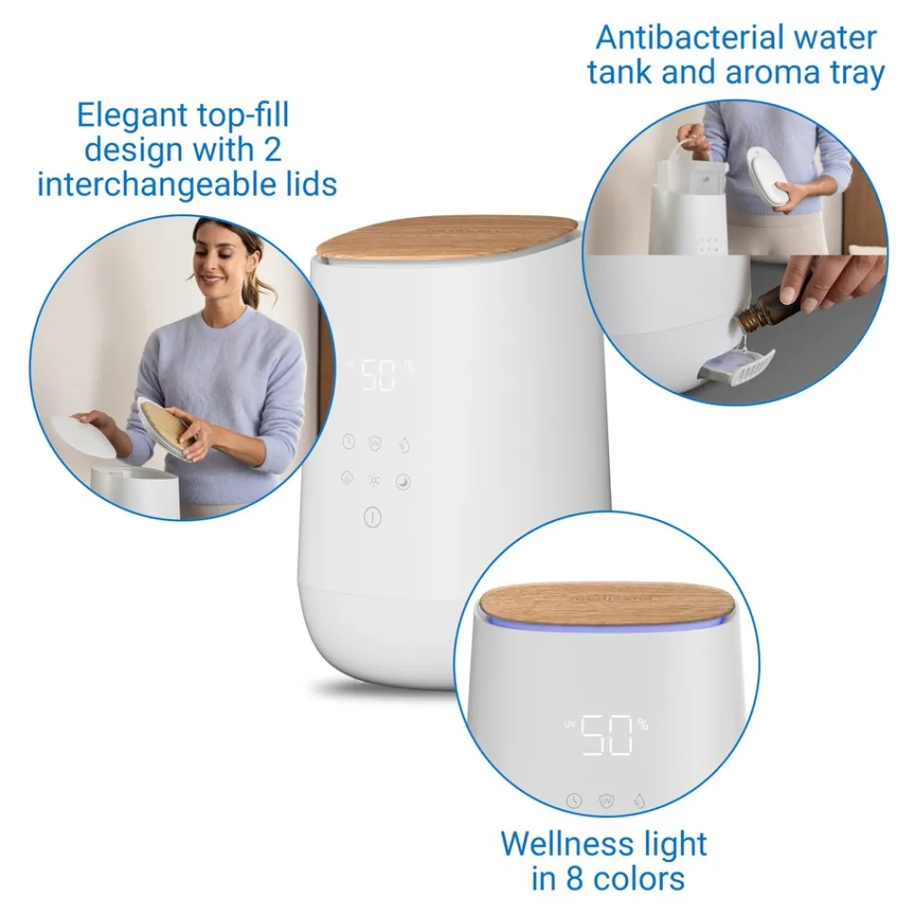 De luchtbevochtiger bevat naast een waterfilter ook UV-C licht voor het reduceren van kiemen & bacteriën in het water, waardoor deze beter aansluit op een gezonde leefomgeving. Tevens heeft deze luchtbevochtiger een ingebouwde sensor die ervoor zorgt dat de luchtvochtigheid zich automatisch aanpast naar het gewenste niveau.
