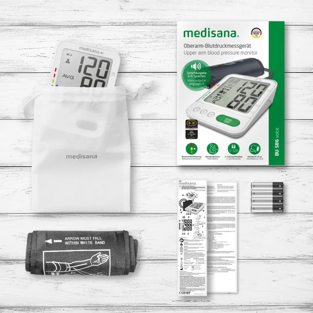 De BU 586 Voice bovenarmbloeddrukmeter van medisana is een gecertificeerd medisch apparaat voor nauwkeurige bloeddrukmeting aan de bovenarm. Dankzij de opblaastechnologie levert hij snellere meetresultaten. De geïntegreerde bewegingssensor zorgt voor nauwkeurige meetresultaten. De speciale functie: Je kunt een spraakuitvoer selecteren in de desbetreffende landstaal. Je kunt kiezen uit Duits, Engels, Nederlands, Frans, Italiaans en Turks.