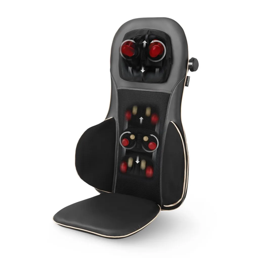Twee massagekoppen in het nek-schoudergebied en twee roterende dubbele massagekoppen in het ruggebied zorgen voor een intensieve Shiatsu-massage. Je kunt kiezen tussen de massagezones “Bovenrug”, “Onderrug” en “Gehele rug”. Het zitkussen is ook uitgerust met luchtkussens voor een nieuw soort ontspanningservaring. Het is ook uitgerust met een inschakelbare warmtefunctie in de massagekoppen in de rug en een automatische uitschakelfunctie na 15 minuten.