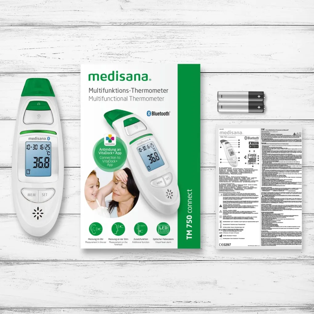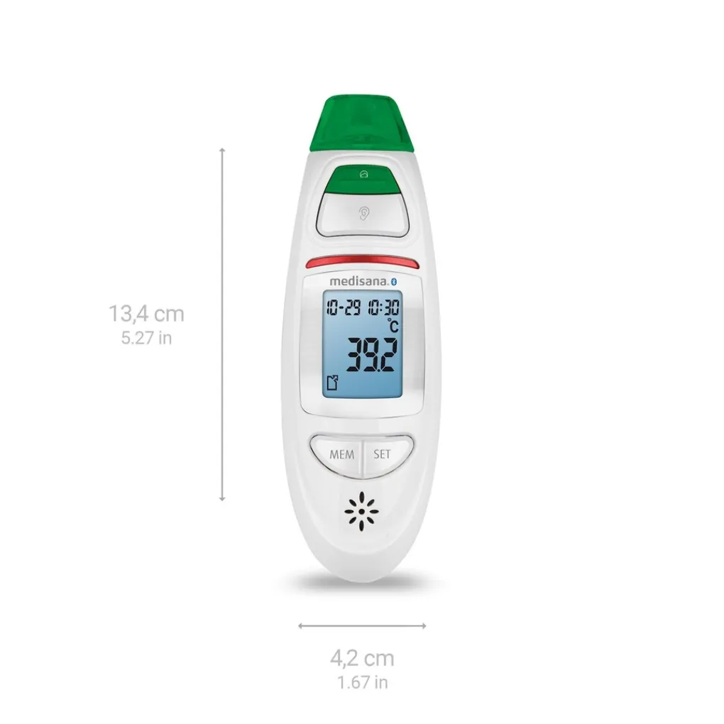 Met de TM 750 connect infraroodthermometer van Medisana kun je de lichaamstemperatuur nauwkeurig meten op het voorhoofd of in het oor. De multifunctionele thermometer geeft een geluidssignaal wanneer hij klaar is om te meten en wanneer de meting voltooid is.