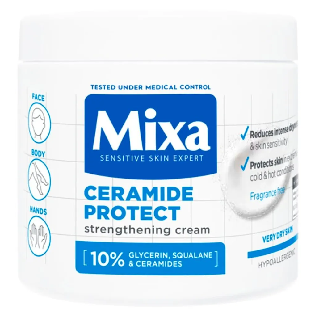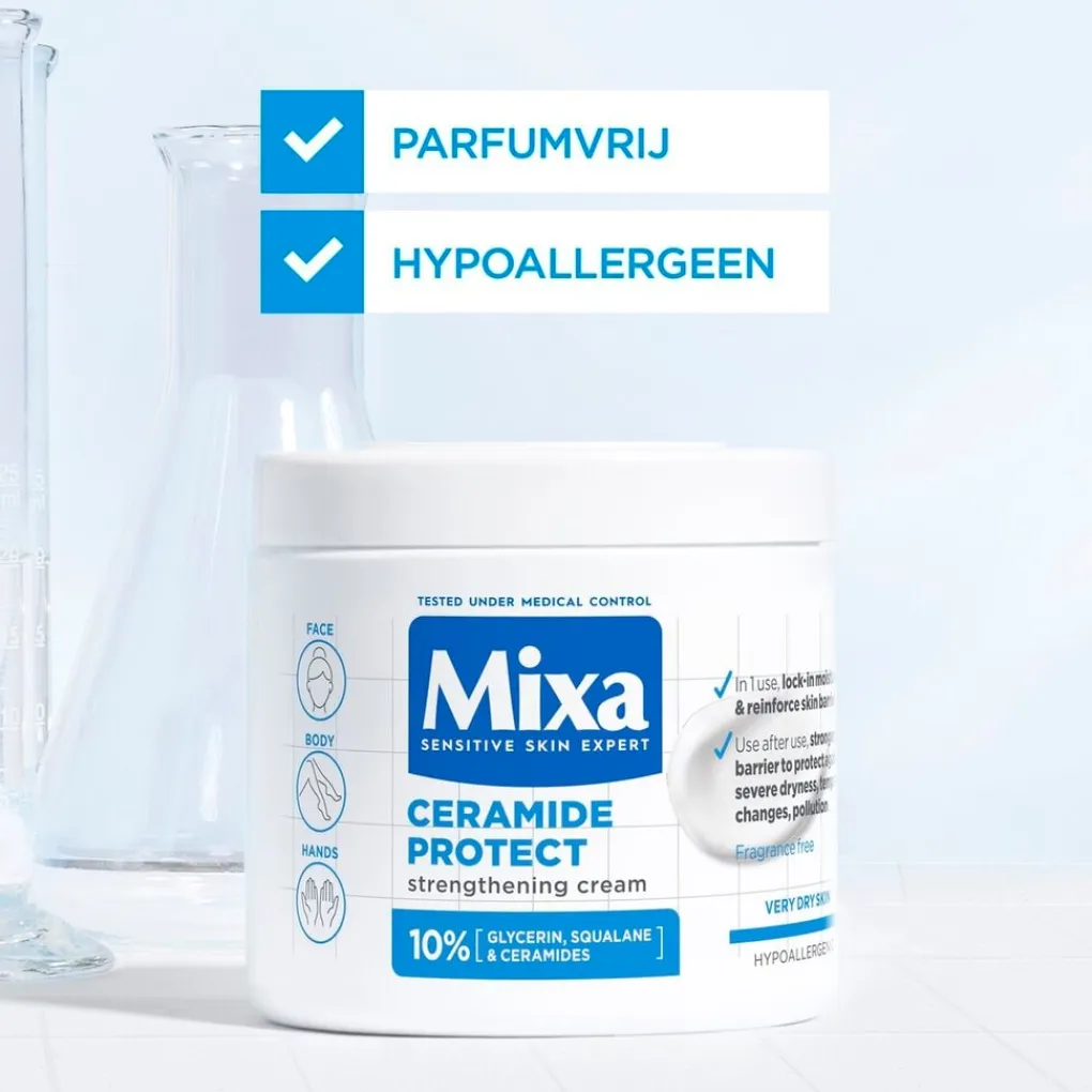 Mixa Ceramide Protect hydraterende crème is hypoallergeen geformuleerd, parfumvrij en getest onder medische controle. Zo weet je zeker dat het geschikt is voor een gevoelige huid. De crème kan gebruikt worden door het hele gezin, inclusief kinderen en baby’s. De niet-vette textuur trekt snel in en kan op elk moment van de dag worden gebruikt op gezicht, lichaam en handen.