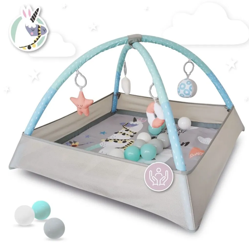 Dit leuke speelkleed is van het merk Momi. Het speelkleed zal zorgen voor uren lang speelplezier voor je kleintje en is op verschillende manieren te gebruiken, namelijk als speelkleed, speelmat en als ballenbak. Het speelkleed komt inclusief met 4 schattige speeltjes om in de speelbogen te hangen en 15 speelballen. Daarnaast is het speelkleed voorzien van opstaande randen voor extra veiligheid en daarnaast een dikkere padding, zodat je kleintje altijd comfortabel en warm ligt.