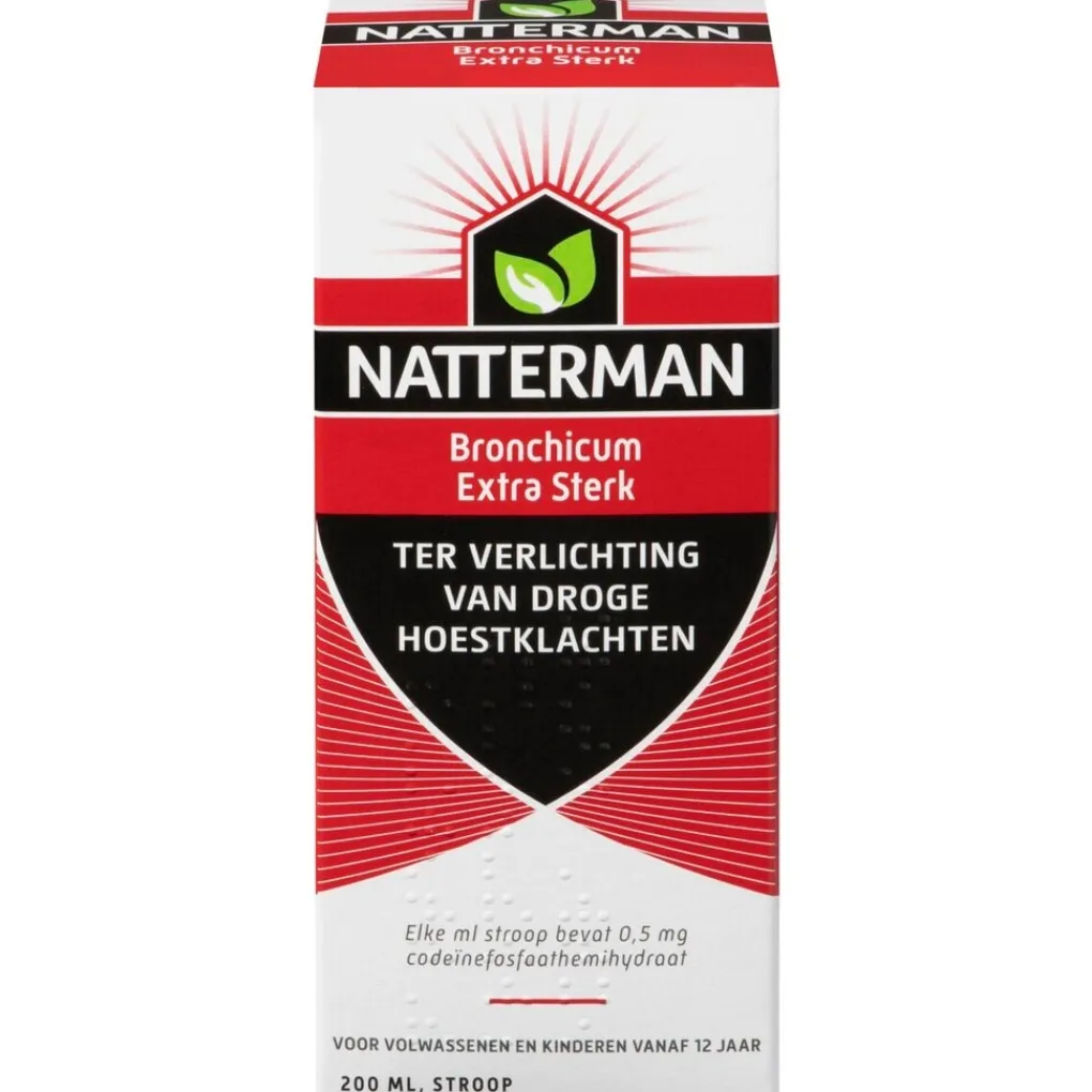 Natterman Bronchicum Extra Sterk Hoestsiroop werkt verlichtend en verzachtend bij droge hoestklachten. De hoestsiroop bevat codeïne dat een hoestprikkel dempende werking heeft en een kruidentincturen voor de verzachtende werking.