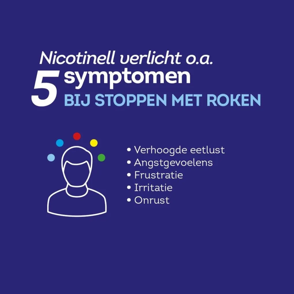 Nicotinell Cool Mint 4mg Kauwgom verlicht onder meer vijf symptomen bij stoppen met roken zoals een verhoogde eetlust, angstgevoelens, frustratie, irritatie of onrust. Het is een snelle hulp om je behoefte om te roken te verminderen.