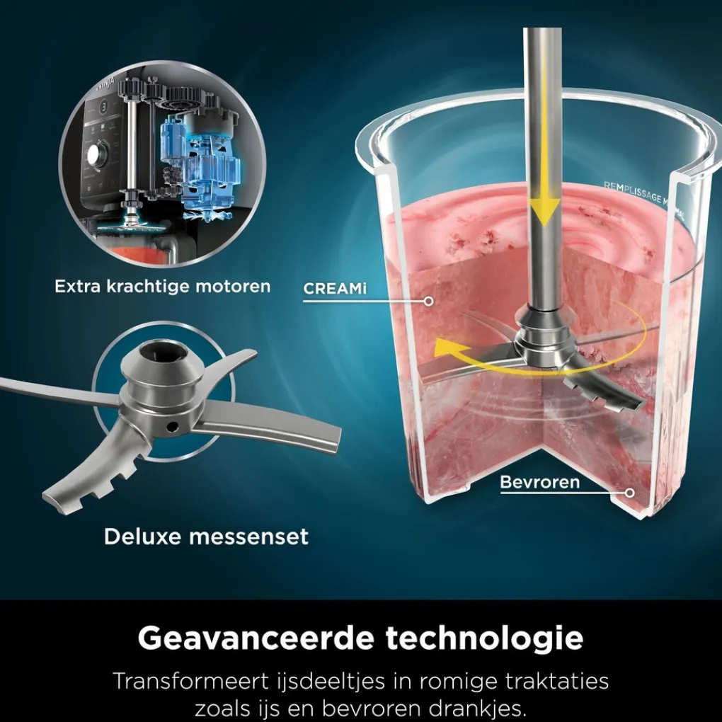 Motor Base met Dual-Drive Motors: Advanced CREAMify Technology verandert bijna alles in een bevroren of romige traktatie met behulp van 10 One-Touch-programma’s.