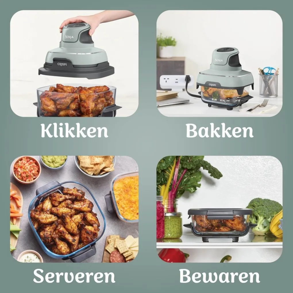Maak kennis met de Ninja CRISPi 4-in-1 compacte, glazen airfryer voorzien van vier functies; Airfryen, Braden, Warmhouden en Opnieuw krokant maken. Klik de lichte 1700 watt PowerPod op de glazen schaal, selecteer je functie, druk op start en je hebt binnen no-time een perfect gegaard gerecht op tafel. Voor kleine en grotere hoeveelheden. Bovendien gebruikt de Ninja CRISPi tot wel 50% minder energie dan een heteluchtoven.*