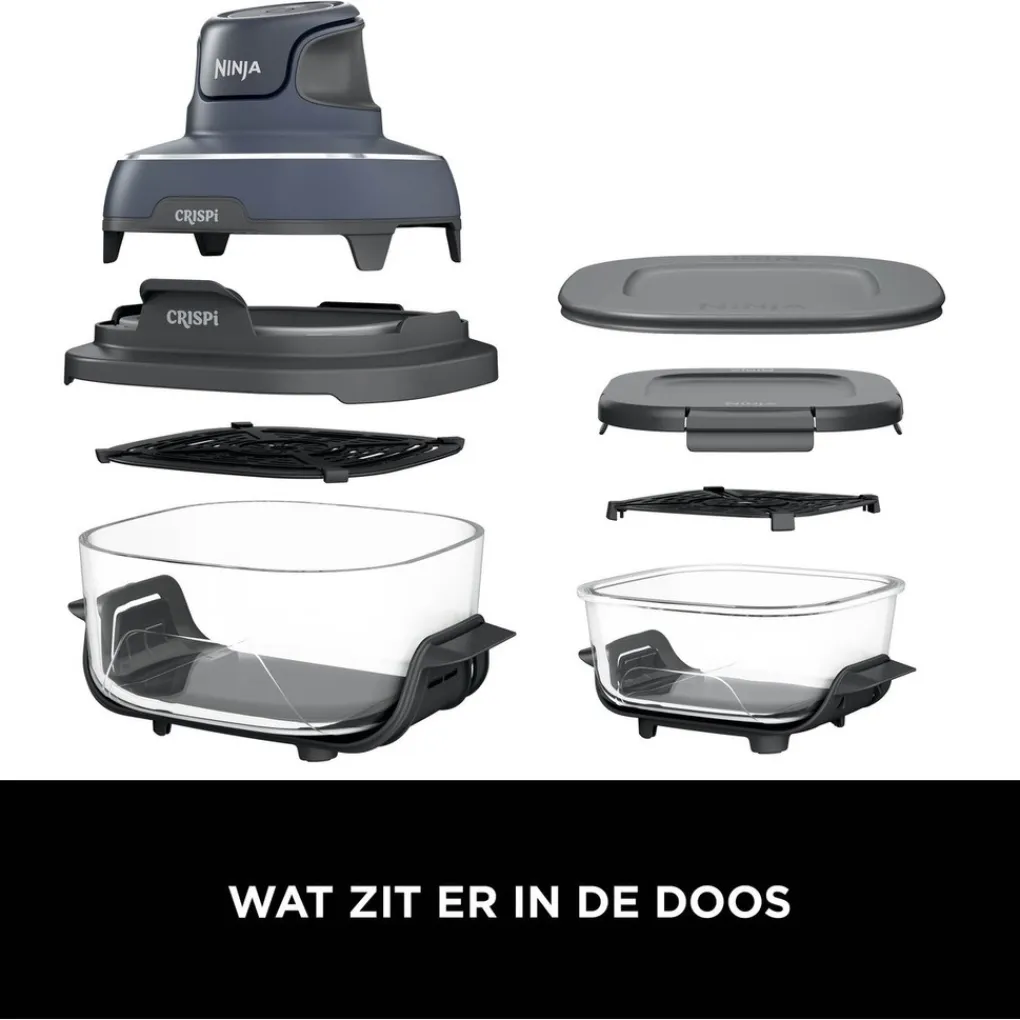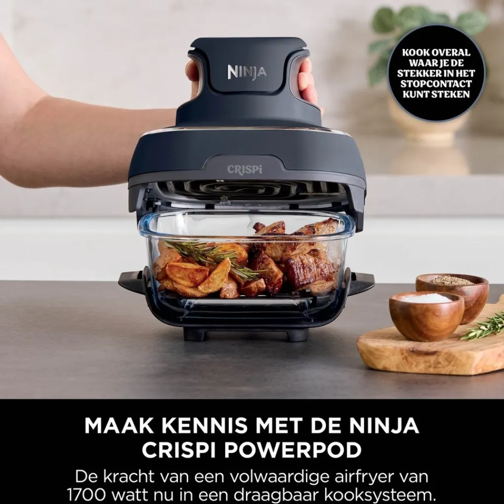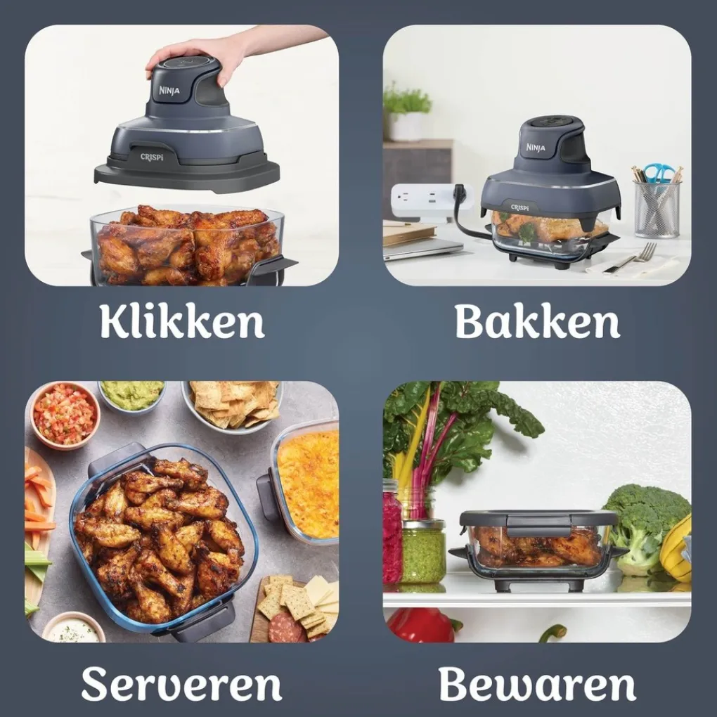 Maak kennis met de Ninja CRISPi 4-in-1 compacte, glazen airfryer voorzien van vier functies; Airfryen, Braden, Warmhouden en Opnieuw krokant maken. Klik de lichte 1700 watt PowerPod op de glazen schaal, selecteer je functie, druk op start en je hebt binnen no-time een perfect gegaard gerecht op tafel. Voor kleine en grotere hoeveelheden. Bovendien gebruikt de Ninja CRISPi tot wel 50% minder energie dan een heteluchtoven.*