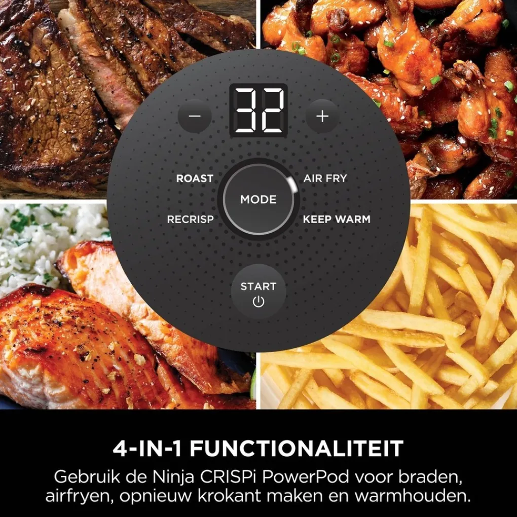 Dit complete alles-in-een-kooksysteem heeft 4 functies: Air Fry (Airfryen), Roast (Braden), Keep Warm (Warmhouden) en Recrisp (Opnieuw krokant maken). Hete lucht tot wel 185 °C warm gaart je eten gelijkmatig en maakt het knapperig. De crispplaten met keramische antiaanbaklaag zorgen ervoor dat de hete luchtstroom goed circuleert. Zo warm je restjes in een mum van tijd op, heerlijk knapperig met behoud van smaak. Geen verspilling meer van eten.