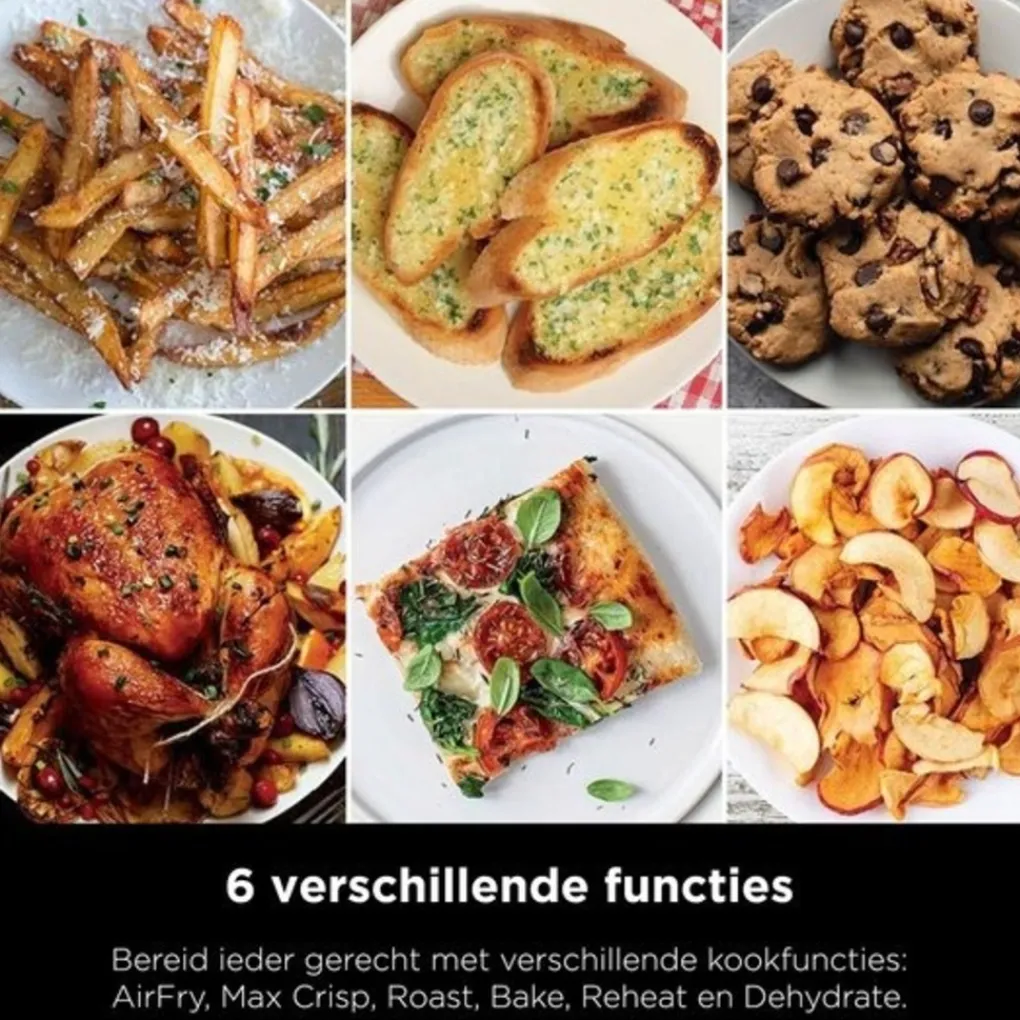 Frituur uw favoriete eten met weinig tot geen olie, met tot 75% minder vet dan traditionele frituurmethoden. U kunt niet alleen hetelucht-frituren, maar ook braden, bakken, dehydreren, opwarmen en met Max Crisp van bevroren tot extra krokant koken. Bovendien verbruikt deze heteluchtfriteuse minder energie dan een oven.