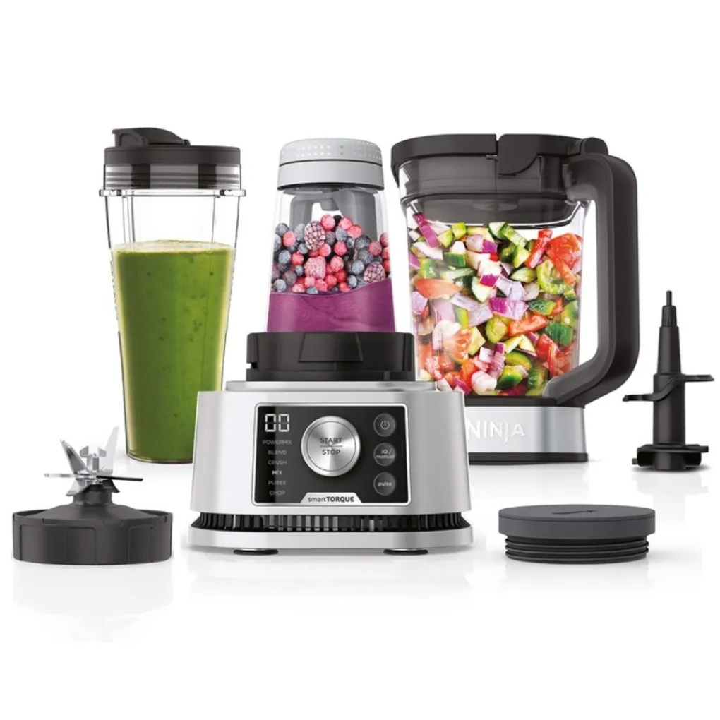 De Ninja Foodi Power Nutri Blender CB350EU combineert maar liefst 3 apparaten in één. Met deze blender kun je namelijk niet alleen zachte mixen en drankjes klaarmaken, maar bereid je ook eenvoudige dikke, smeerbare mengsels, of maak je zelfs zwaar deeg klaar en hak je groente, fruit of vlees. Dit kan allemaal gedaan worden in één van de drie meegeleverde blenderkommen: de 2,1 liter blenderkan, de 700 ml beker en de 400 ml kom. Creëer snel en eenvoudig ijskoude smoothies, bevroren drankjes, milkshakes, sauzen, humus, notenpasta’s, koekjesdeeg, salades en nog veel meer met deze krachtige blender met een stijlvol, zilver design.