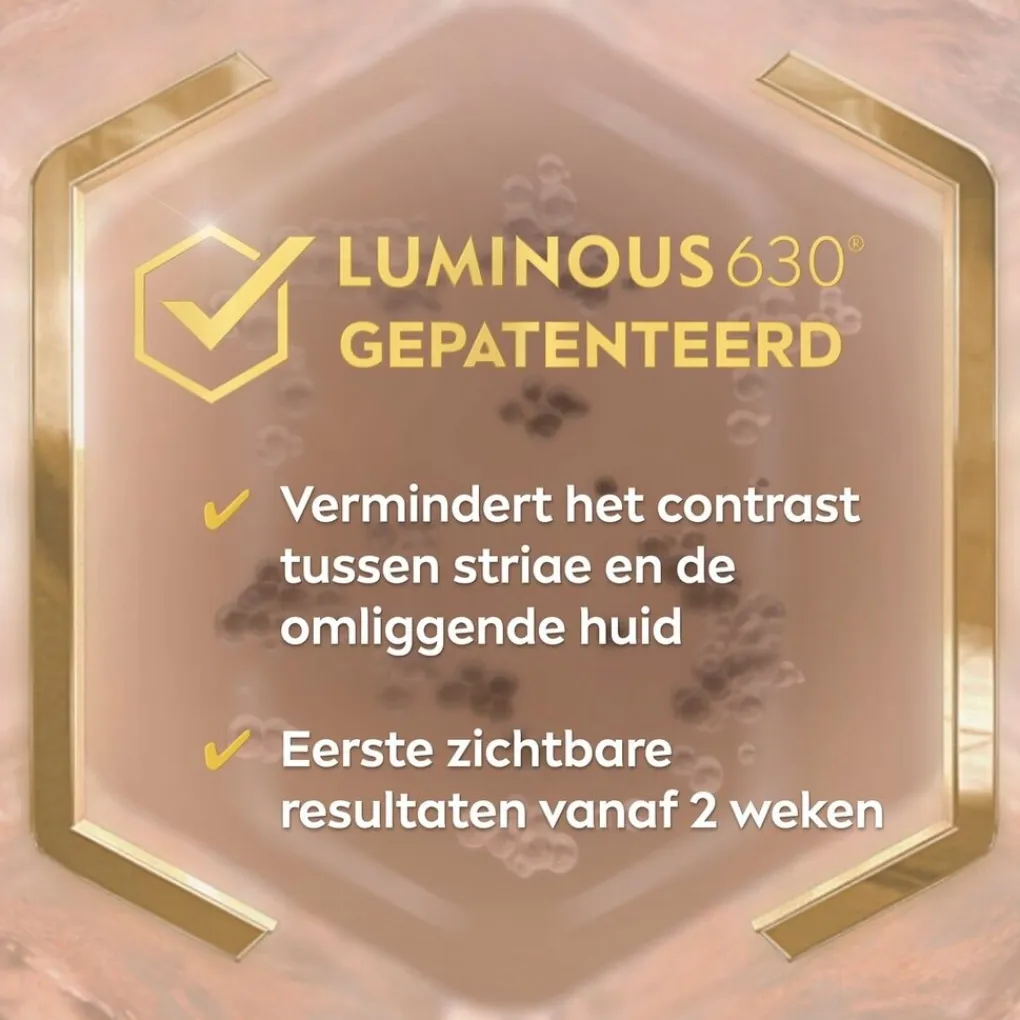 Door regelmatig te masseren, helpt het olie-serum niet alleen bestaande striae minder zichtbaar te maken, maar voorkomt het ook dat er nieuwe ontstaan. De formule hydrateeert je huid tot 48 uur lang, voor een soepele en gladde huid. Het olie-serum is geschikt voor alle huidtypes en zorgt voor een zachte, gladde, gehydrateerde en gezond uitziende huid. Geef je huid de zorg die het verdient met het Luminous630 olie-serum.