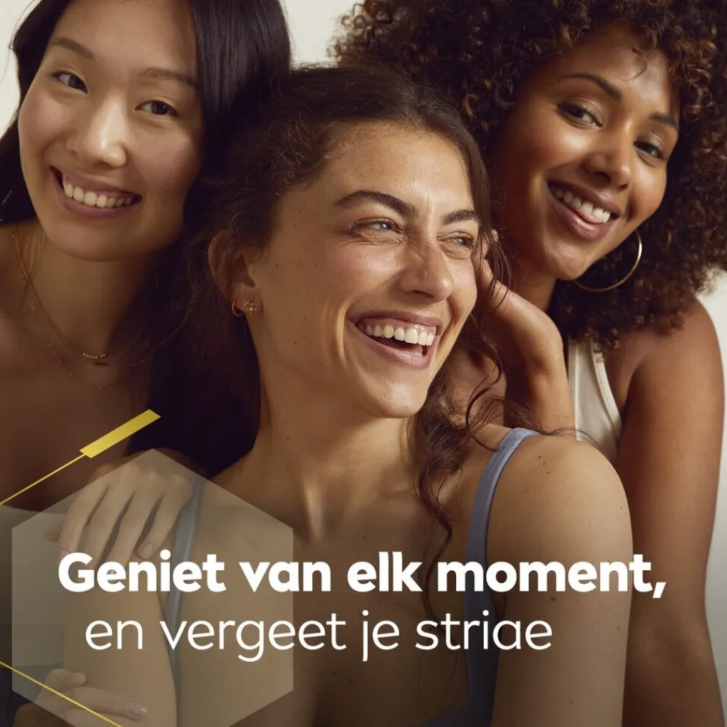 • Onmiddelijk glad huidgevoel op striae/striemen en hydrateert 48** uur lang