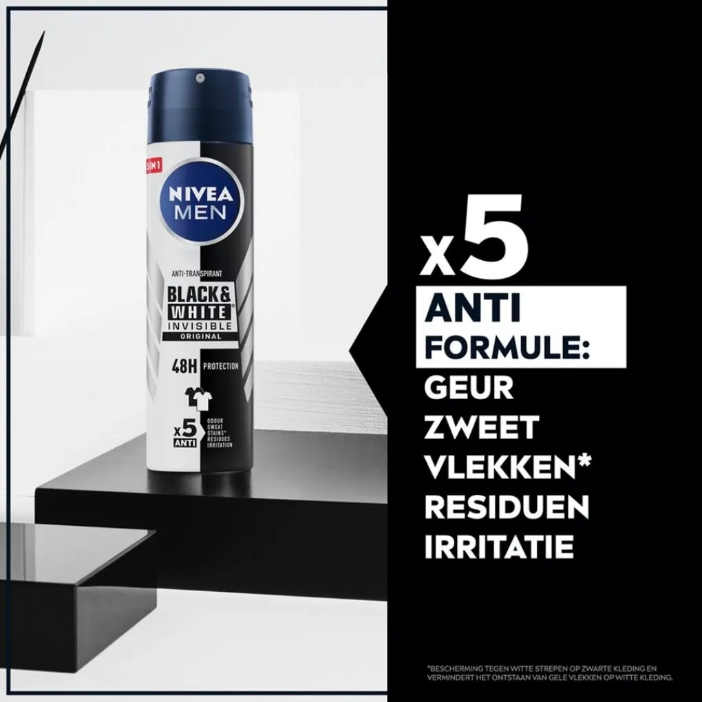 Je witte kleding blijft wit en je zwarte kleding zwart dankzij NIVEA Men Invisible For Black & White Deodorant Spray. De deodorant beschermt je oksels 48 uur lang tegen transpiratie en nare geurtjes.