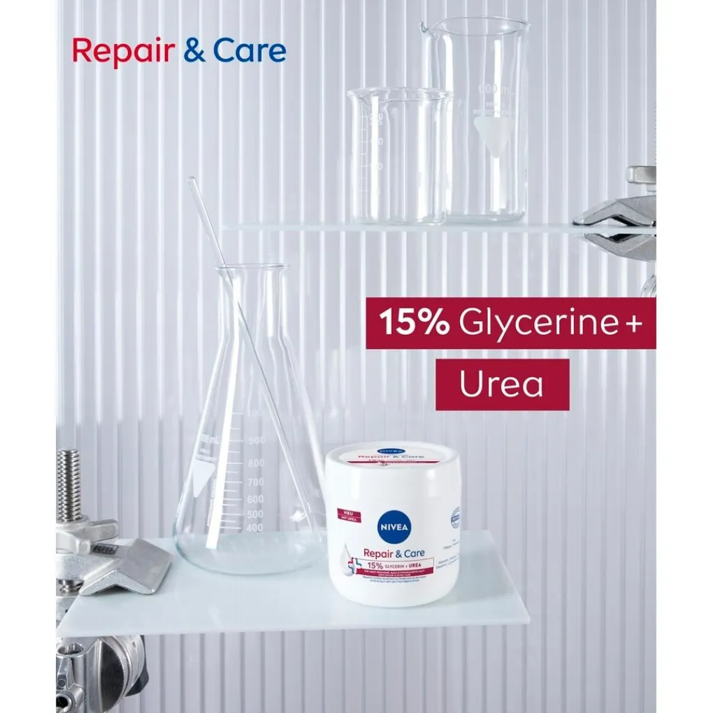 De NIVEA Repair & Care Crème met 15% glycerine en urea complex verlicht tekenen van een zeer droge en ruwe huid. Het voedt je huid gedurende 72 uur*, hydrateert intensief en voorkomt vochtverlies.