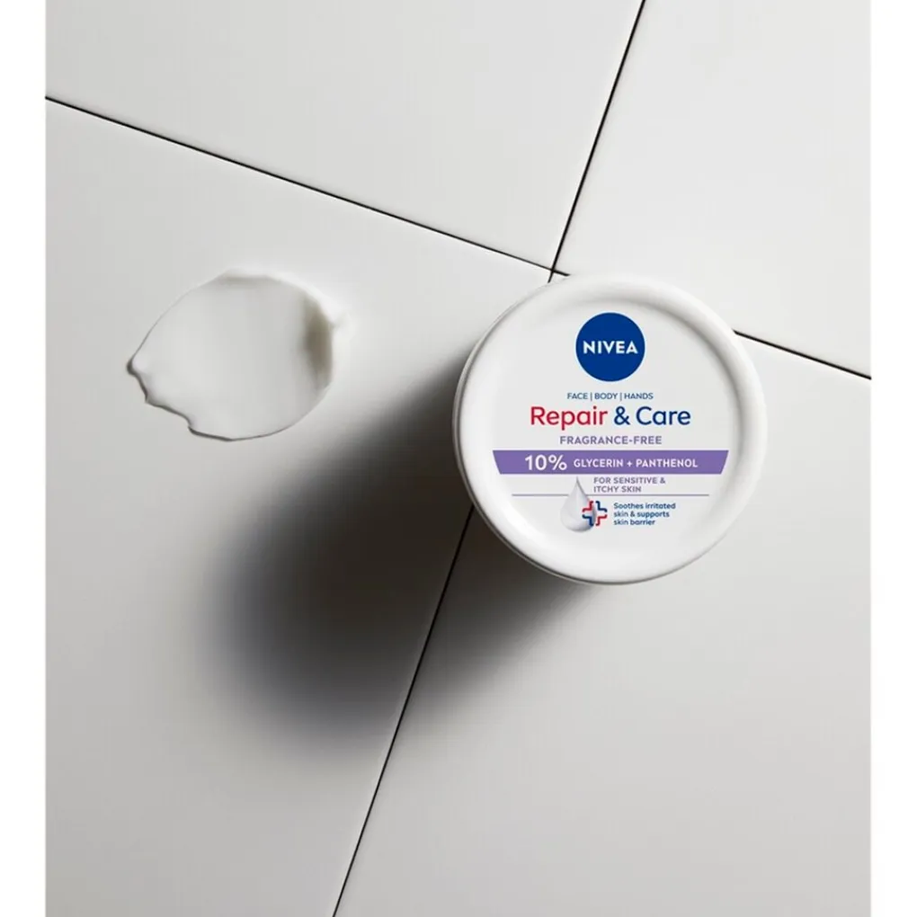 De parfumvrije NIVEA Repair & Care Fragrance Free Bodycrème bevat 10% glycerine en panthenol en helpt je gevoelige en geïrriteerde huid te kalmeren. Het biedt langdurige verlichting bij een droge huid.
