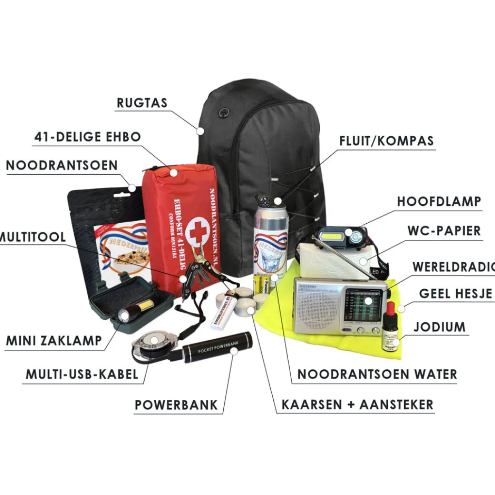 De overheid adviseert voor dit soort rampen en calamiteiten een noodpakket in elk huis en voertuig te hebben. Daarmee kun je de eerste 24 uur overleven zonder hulp van buitenaf. In een noodpakket zit onder andere een radio om naar de rampenzender te luisteren, een zaklamp en een EHBO-kit, een powerbank om je telefoon op te kunnen laden. Voor 1 dag aan 25 jaar houdbaar eten en drinken (noodrantsoen) en natuurlijk een hoog gedoseerd Jodium-supplement welke je nodig kan zijn in geval van blootstelling aan radioactief jodium na een (kernramp/kernexplosie).