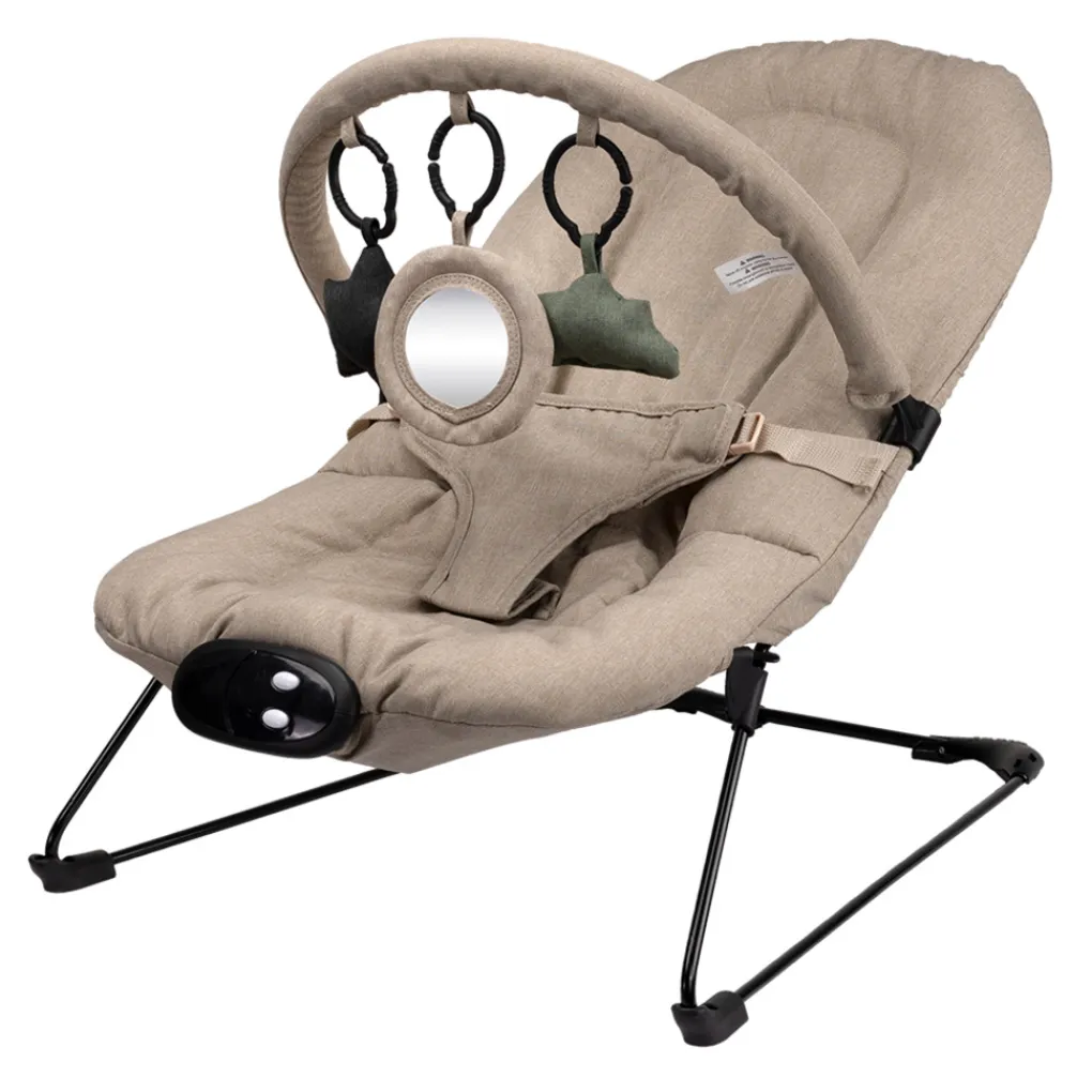 De wipstoel heeft een leuke speelboog met 3 speeltjes. De speeltjes bestaan uit 2 (knijp)speeltjes die geluid maken en 1 spiegeltje. De speelboog is afneembaar maar ook weer eenvoudig vast te klikken. Jouw kindje wordt veilig in de bouncer bevestigd door middel van een 3 -puntsgordel. Is de bekleding vies? Geen probleem, deze is afneembaar en wasbaar in de wasmachine.