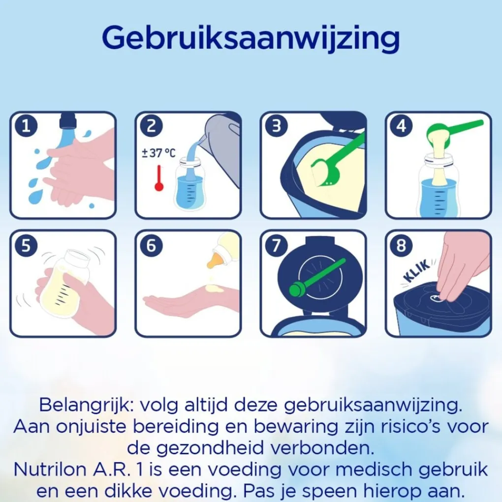 – Gebruik Nutrilon A.R. 1 alleen onder medisch toezicht. Wil je Nutrilon A.R. 1 gebruiken? Overleg dan met je verloskundige, consultatiebureau of arts.
