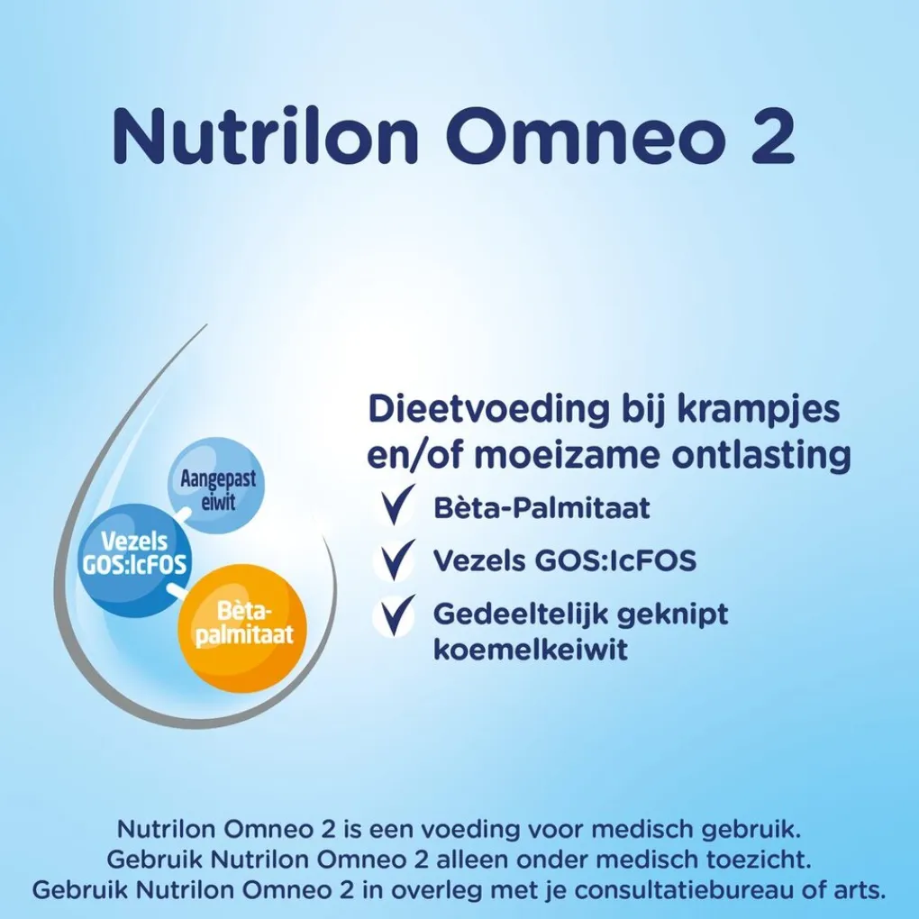 – Gebruik Nutrilon Omneo 2 alleen onder medisch toezicht. Wil je Nutrilon Omneo 2 gebruiken? Overleg dan met je consultatiebureau of arts.