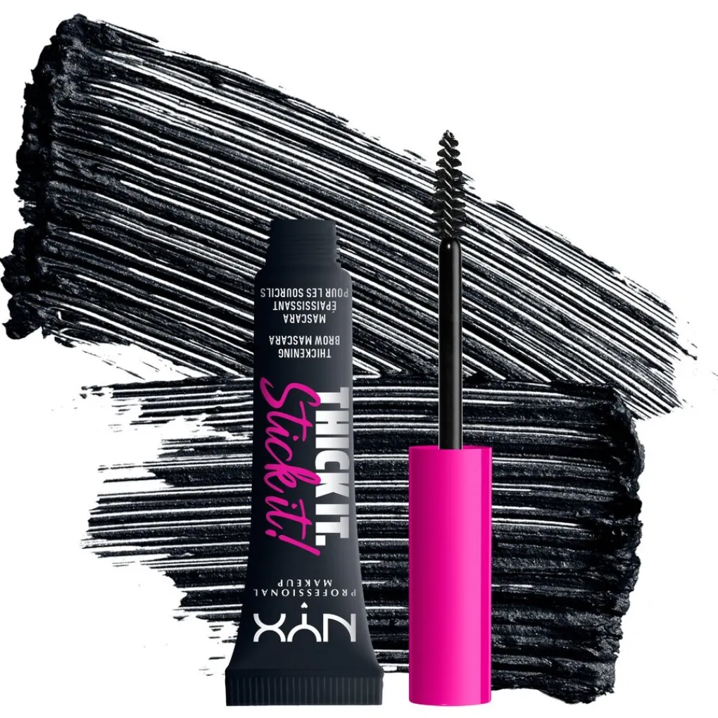 Stick it to ‘em met de vegan NYX Professional Makeup Thick It. Stick It! Black Brow Mascara. De wenkbrauwmascara met getinte en haarachtige vezels van plantaardige oorsprong geeft tot 16 uur lang resultaat.