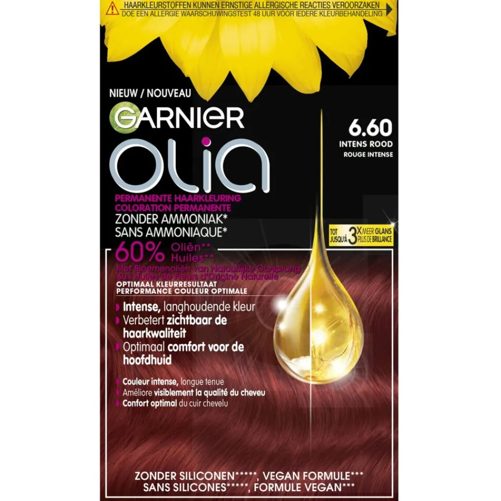 Garnier Olia 6.60 Intens Rood Permanente Crèmekleuring is een permanente haarkleuring op basis van oliën en biedt tot 100% grijsdekking. Het bevat geen ammoniak voor een aangename geur.