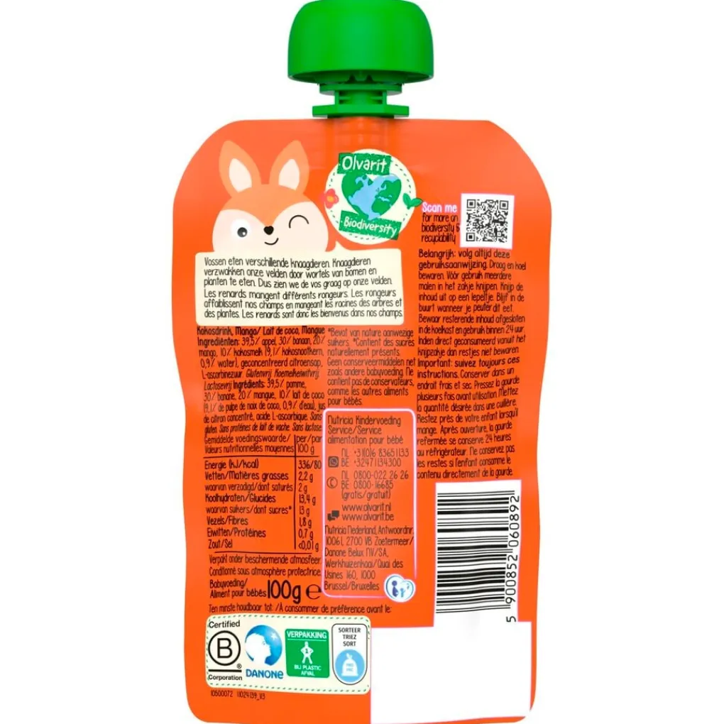Olvarit 12+M Kokosmelk Mango Knijpfruit is gemaakt met pure en natuurlijke ingrediënten. Het fruithapje is geschikt voor kinderen vanaf 12 maanden oud.