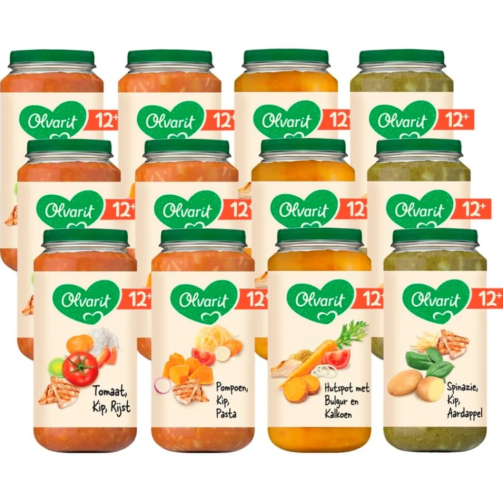 Het Olvarit 12+M Maaltijd Variatiemenu bevat vier smaken babyvoeding. De babyhapjes met pure en natuurlijke ingrediënten voor baby’s vanaf 12 maanden hebben een herkenbare smaak en textuur die bijdragen aan de smaakontwikkeling.