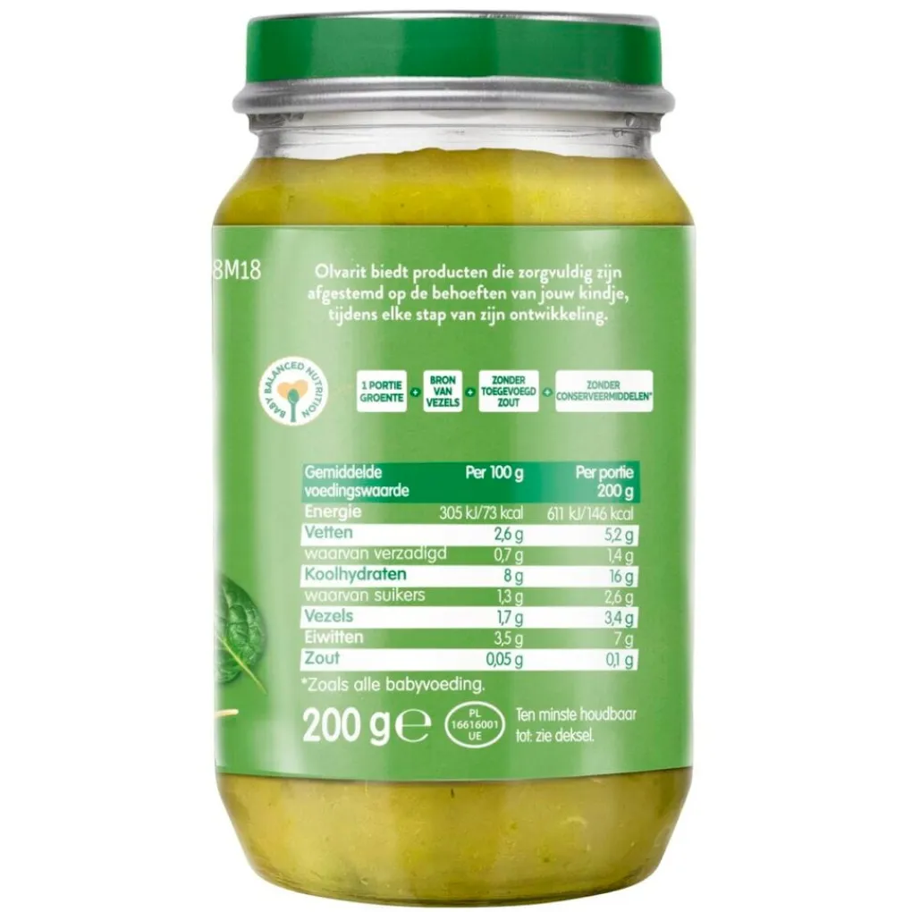 Het Olvarit 8+M Pasta Spinazie Zalm Maaltijdpotje bevat pure en natuurlijke ingrediënten voor baby’s vanaf 8 maanden. De babyvoeding heeft een herkenbare smaak en textuur die bijdragen aan de smaakontwikkeling.