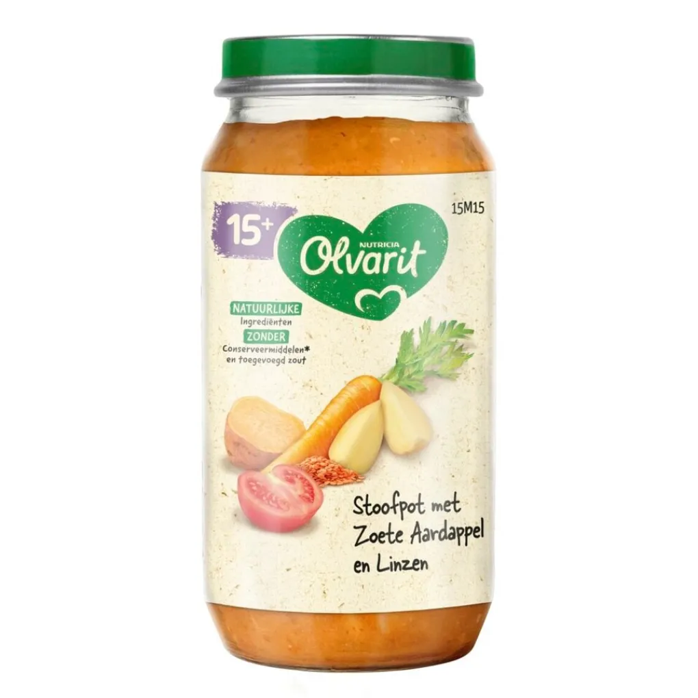 Nutricia Olvarit 15+M Stoofpot met Zoete Aardappel en Linzen is een babyhapje met pure en natuurlijke ingrediënten voor je baby vanaf 15 maanden oud.